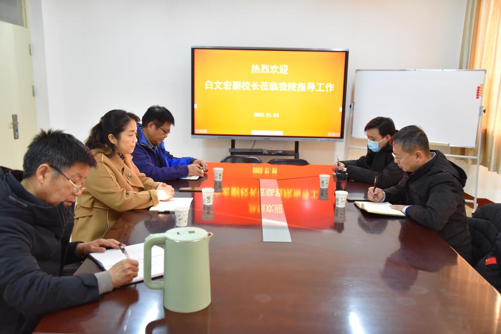 白文宏听取汇报后,对学院近期工作及近几年的发展进步给予充分肯定,对学院领导班子团结一心带领师生勇于改革、奋力争先、人才培养质量不断提升、学院声誉逐步提高的良好态势表示认可赞扬。他强调要进一步提高政治站位,抓住学校迁建的契机,围绕学校改革发展思路,结合学院专业特点,加强对外联络,争取在横向项目上取得突破,为服务地方经济发展作出贡献。