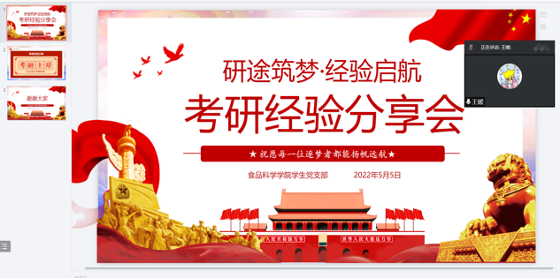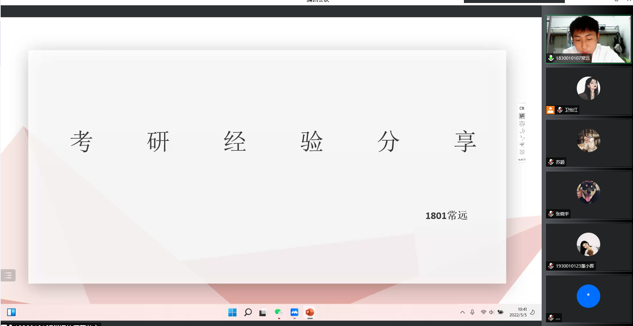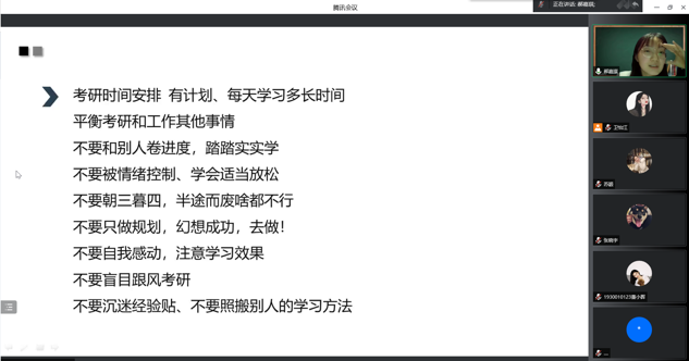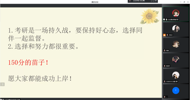 为了教育引导学生树立正确的考研观念、掌握考研技巧,5月5日,由明升MS88体育登录学生党支部联合举办的“研途青年说”活动,以“研途筑梦,经验启航”为主题开启第一讲。活动通过腾讯会议举办,邀请4位18级考研成功上岸的同学进行分享,专职组织员卢锦斌及19级考研同学参加。