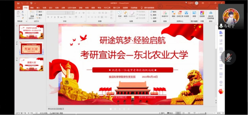 为让学生更好地了解考研院校、专业情况及优势,6月18日,明升MS88体育登录学生党支部联合举办“研途青年说”第三讲——东北农业大学专场宣讲活动。活动通过腾讯会议举办,由18级考研成功上岸东北农业大学食品学院的郝嘉琪进行宣讲,19级考研同学及20、21级有意愿备考同学参加。