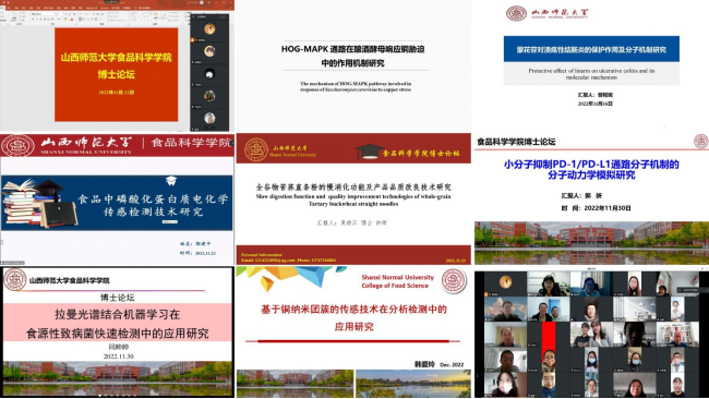 本学期博士论坛由明升MS88体育登录任梦梦、晋程妮、郭建平、吴晓江、郭妍、闫帅帅、韩爱玲七位新进教师就博士研究工作作了学术报告。七位老师都做了充分准备,课件精美,表达准确简练,分别就代谢调控的分子机制、活性成分作用机制、新品研发与质控、分子动力学模拟研究、传感器检测、致病菌快速检测及荧光检测等方面的研究进展与取得成果作了精彩的报告,线上参会者积极交流科研新方法,碰撞灵感火花,创新思维模式,以融合多学科知识提升解决问题能力和创新能力。